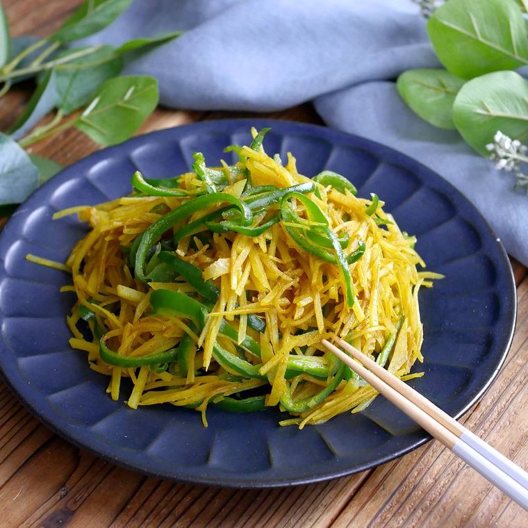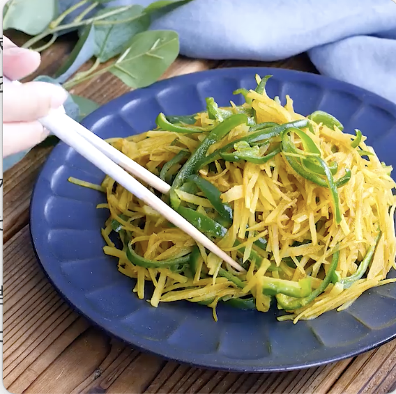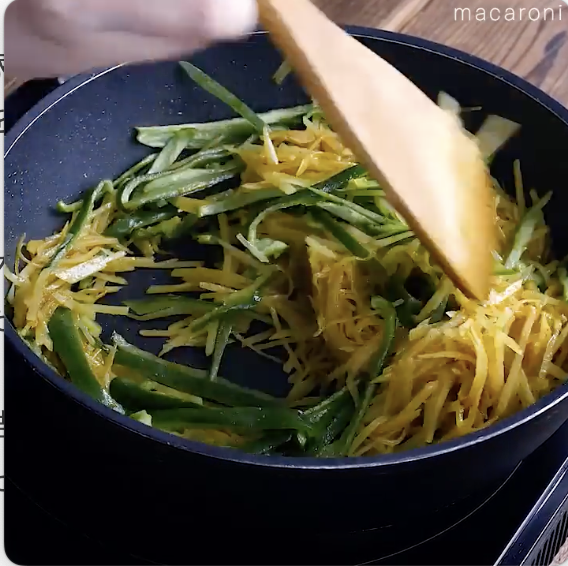4: 【調味料】を加えて全体を和え、ピーマンを加えて中火で1分ほどさっと炒めたら塩で味を調えます。