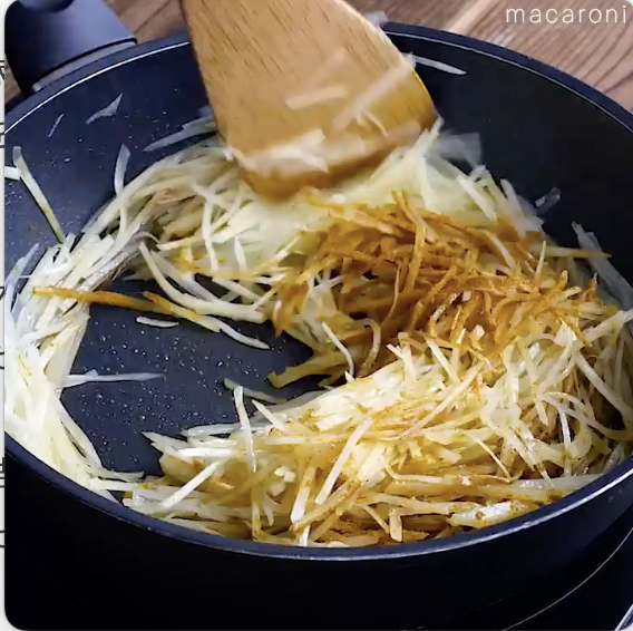 3: フライパンにサラダ油を引いて熱し、じゃがいもを加えて全体に油が回るまで中火で2分ほど炒めます。