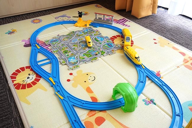 ベッドの横いっぱいに広がるプラレールにはフロアシートが敷いてあるので、靴を脱いで思い切り遊べます。