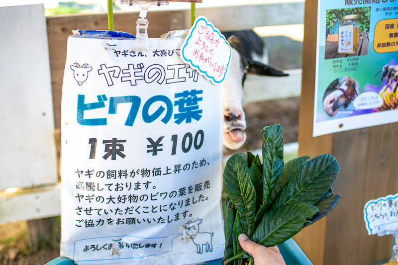 ヤギさんは、こちらのエサも大好きですが、もっと好きなのが「ビワの葉」。写真用に手で持ったら、葉っぱの後ろから顔を出してなんとか食べようと一生懸命。ビワの葉はこの倍量くらいで1束100円。エサ代はヤギのワクチンや健康診断代に使われるので、ぜひビワの葉をあげてみてください。面白いくらいに食べてくれますよ。