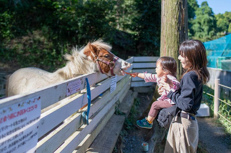 ミニュチュアホースの「コロンちゃん」も大人気。けっこうな勢いでニンジン(1カップ100円)を食べる! いたずらで甘噛みをしてくることもあるので、シャッターチャンス! いや、気をつけましょう。