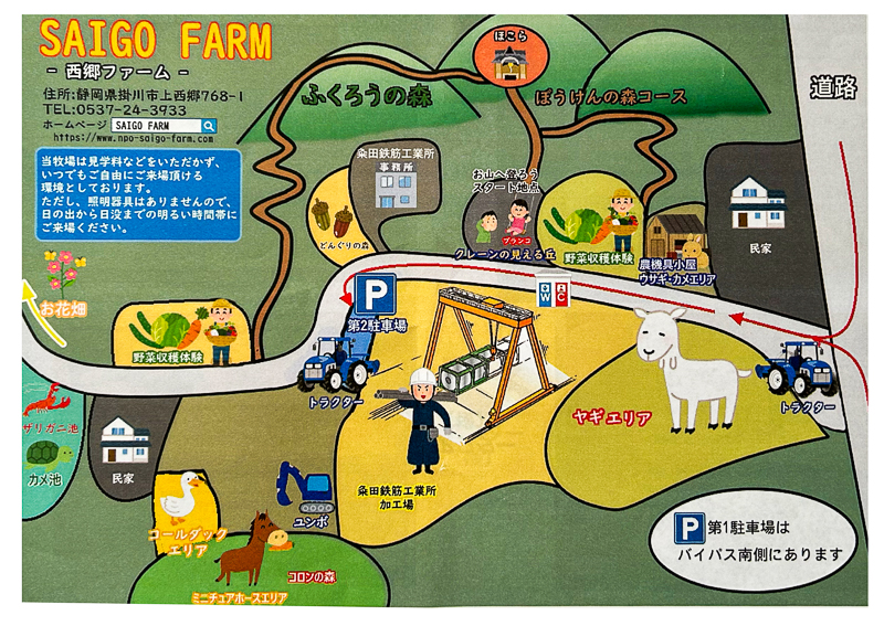 入場無料の牧場の名前は「SAIGO FARM」。掛川バイパスの西郷I.Cを降りて車で3分の「粂田鉄筋工業所敷地内」にある手作りの牧場です。