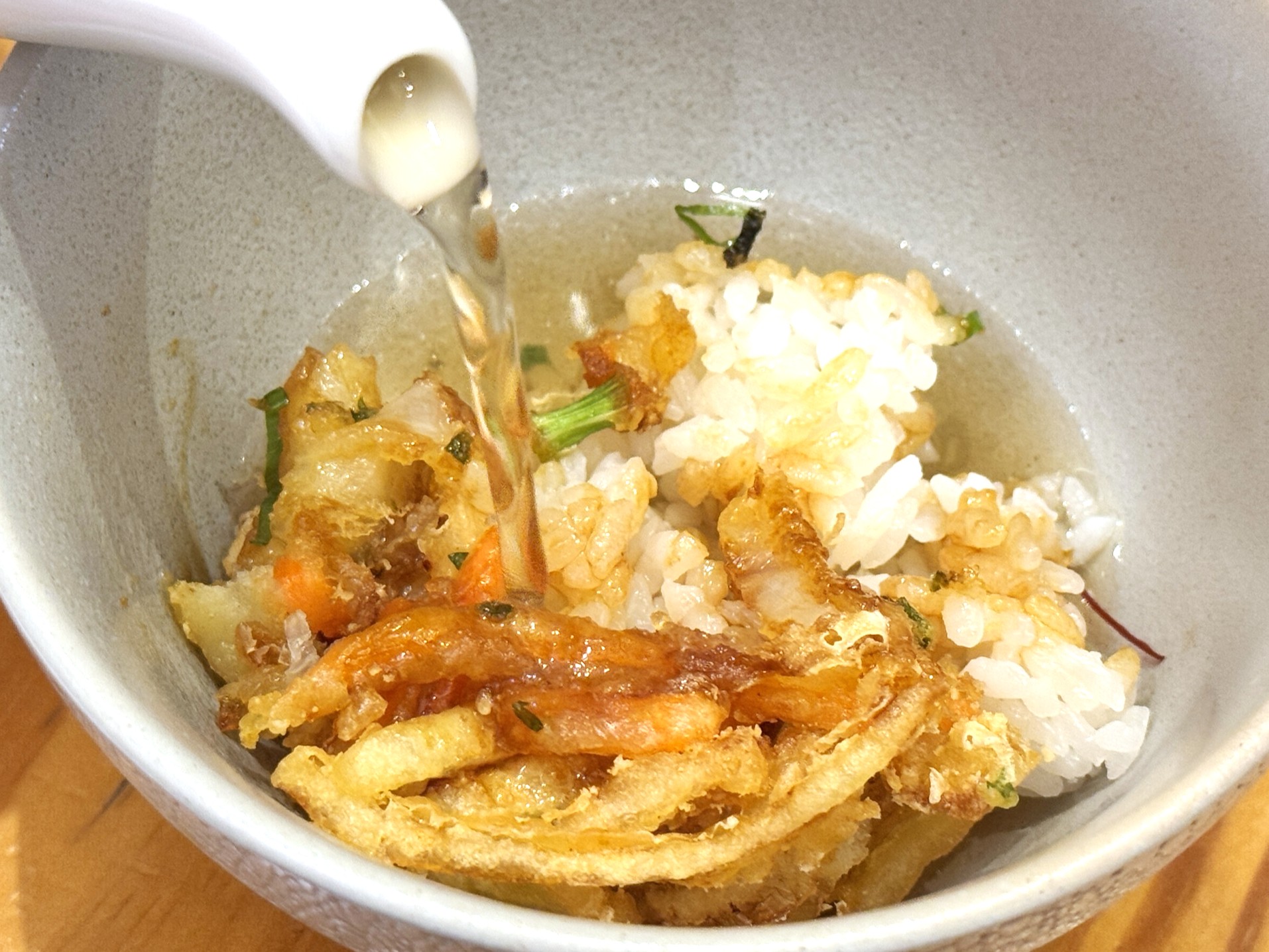 かき揚げの上には糸唐辛子が乗っており、そのままお茶漬けにすると辛味が強くなります。