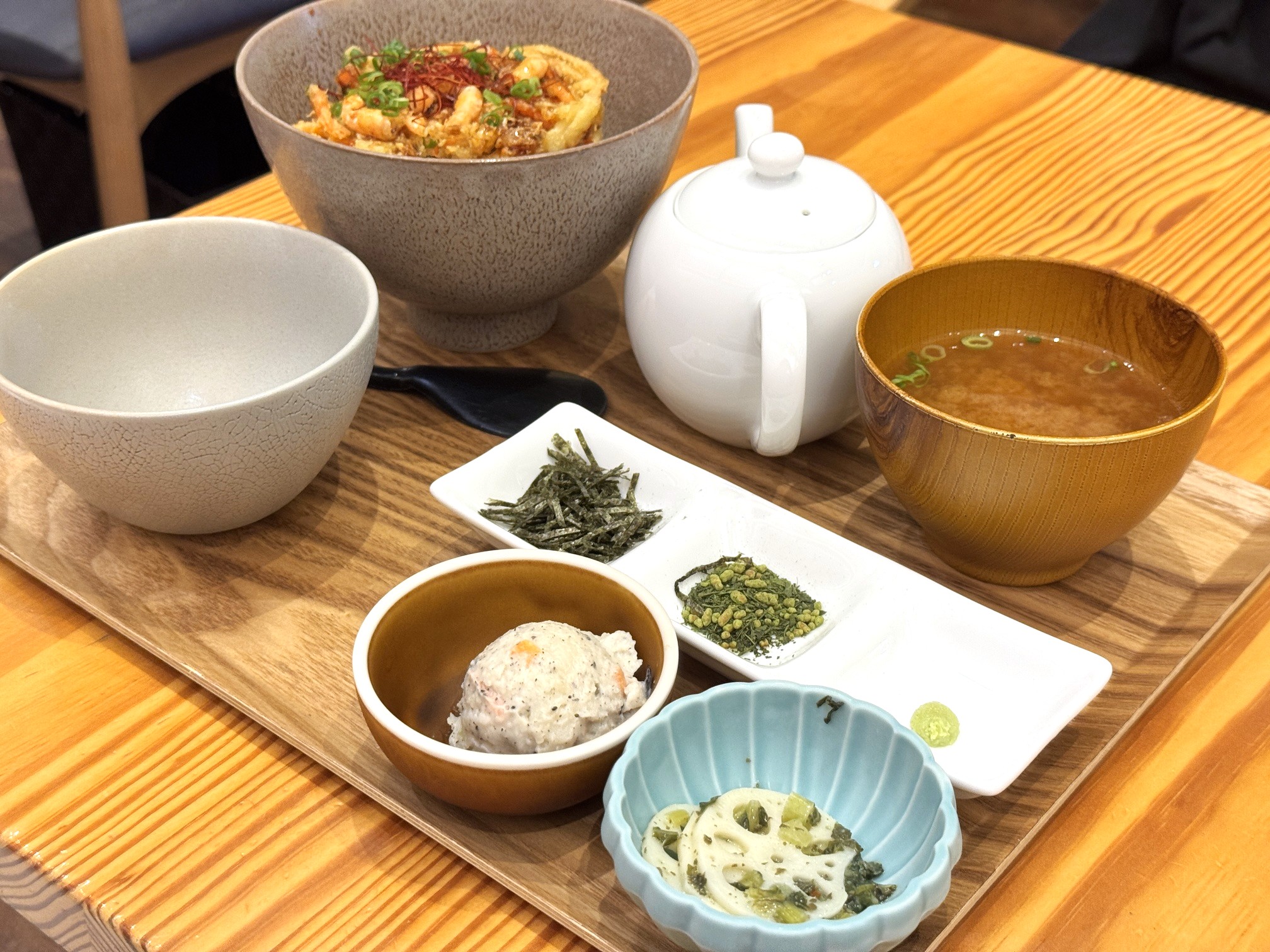 同行の友人がオーダーした「海老のかき揚げ天茶風ひつまぶし御膳」は、小海老がたくさん入ったかき揚げを名古屋名物のひつまぶし風にアレンジできるユニークなひと品。