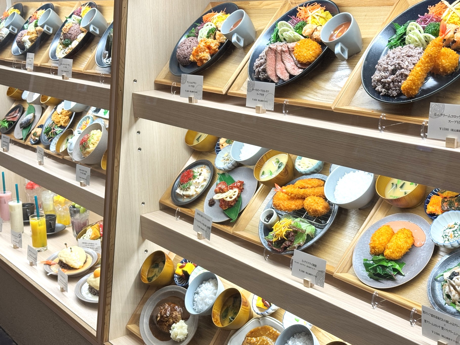 店前で目を惹くのは、ショーケースにずらりと並ぶたくさんの食品サンプル。おしゃれなワンプレート料理からボリュームたっぷりな御膳、種類豊富なドリンクまで、同店で提供されているものほとんどの商品ビジュアルをここで確認することができます。