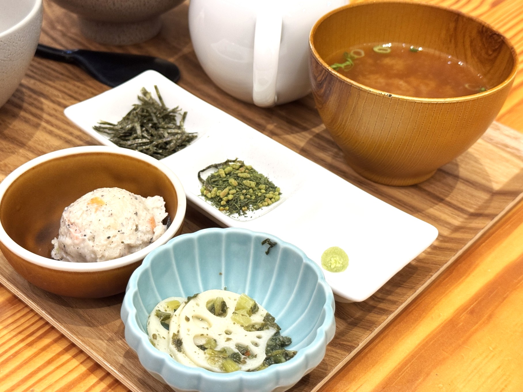 トレーの上にはつけあわせの小鉢やひつまぶしを作るための薬味やトッピングがずらり。