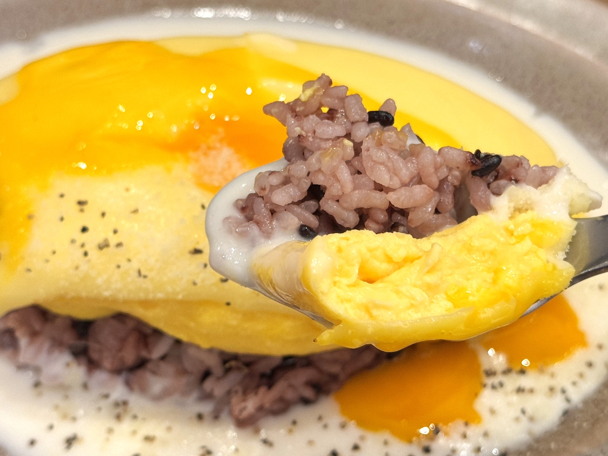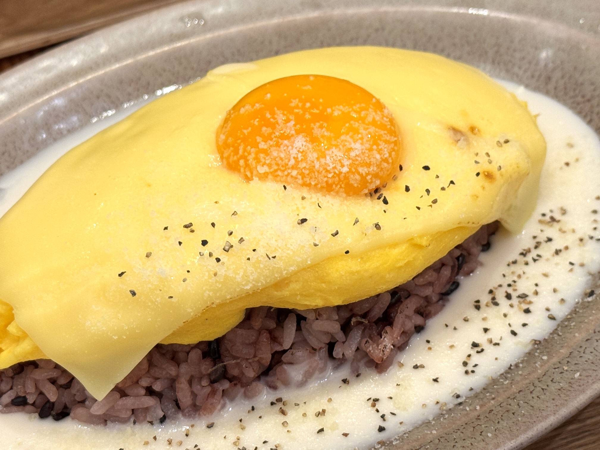 クリームソースと卵黄を使い、定番人気のパスタ「カルボナーラ」をイメージした「カルボオムライス」は、チーズとブラックペッパーが香ばしいビジュ良しなひと皿。