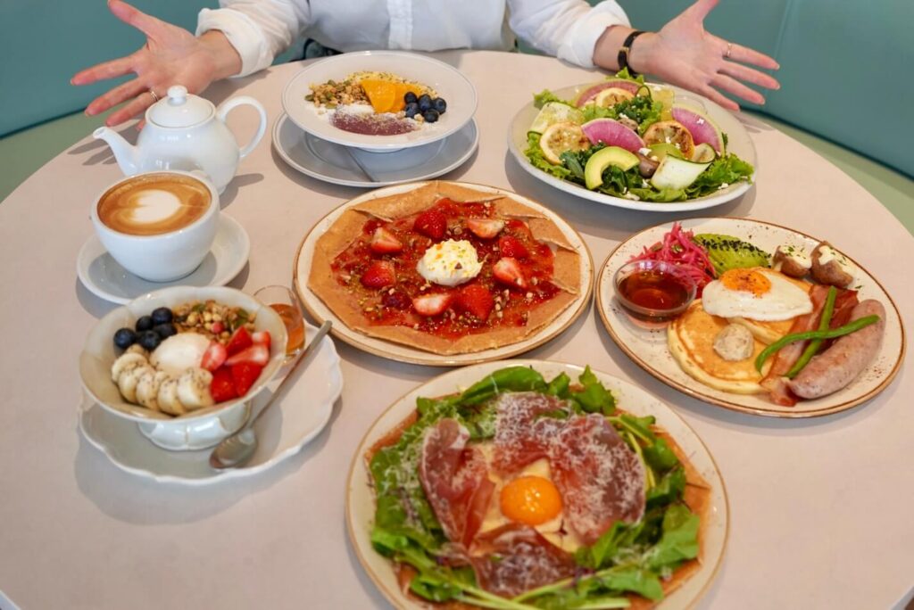 看板商品のパンケーキをはじめ、色鮮やかな新鮮野菜を使ったサラダやグリークヨーグルトなど、ここでしか味わえないメニューがずらりと揃っています。