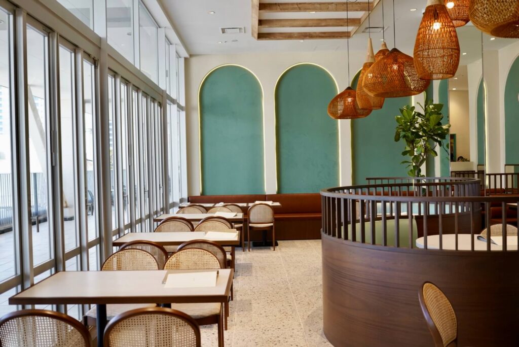 ペールグリーンの壁がやさしいアクセントになった店内は、天井から下がるペンダントライトの柔らかな光に包まれ、ナチュラルで温もりのある雰囲気に。