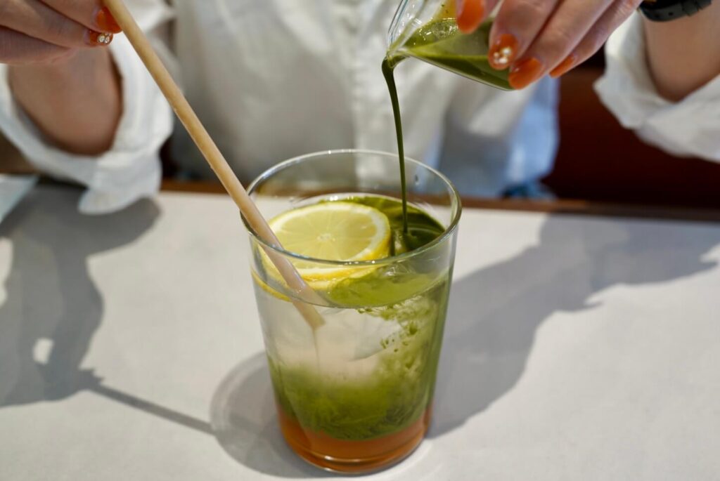 よくかき混ぜたハニーレモネードの上から別添えの抹茶を注いで飲んでみました。シロップの甘みと同時に爽やかな抹茶の香りが口の中に広がります。美しいグラデーションと、少しとろっとした食感がおもしろい一杯です。