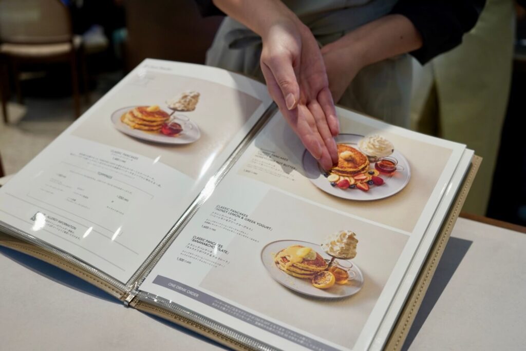 メニューを手に取りながら、リニューアル後に登場したパンケーキの新メニューについて、スタッフさんが丁寧に説明してくれました。素材やこだわりのポイントなどを聞いているうちに、期待がどんどん高まっていきます。