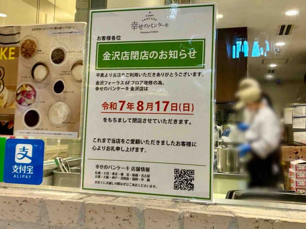 『金沢フォーラス』にある『幸せのパンケーキ 金沢FORUS店』が閉店するらしい。