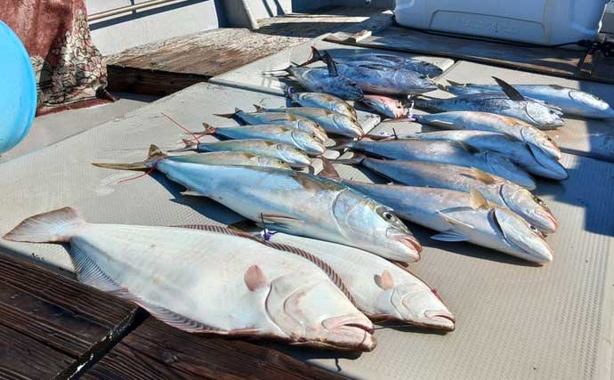 10月4日、長崎県平戸市早福港から光義丸が早福沖の落とし込み釣りに出船。前田さんは1人でカンパチ4kg、3kgにカツオ2.5kg3尾をキャッチ。落とし込みシーズンとなり、大型ヒラマサ狙いで出船中。