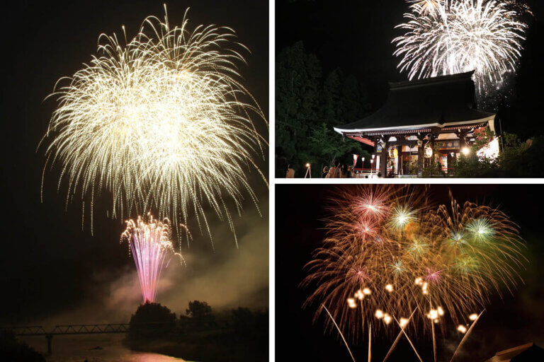 1,200余年もの伝統を誇る千手観音の例大祭に行われる花火大会。多くの参拝者が集まるほか、参道には露店が立ち並び、にぎわいを見せます。