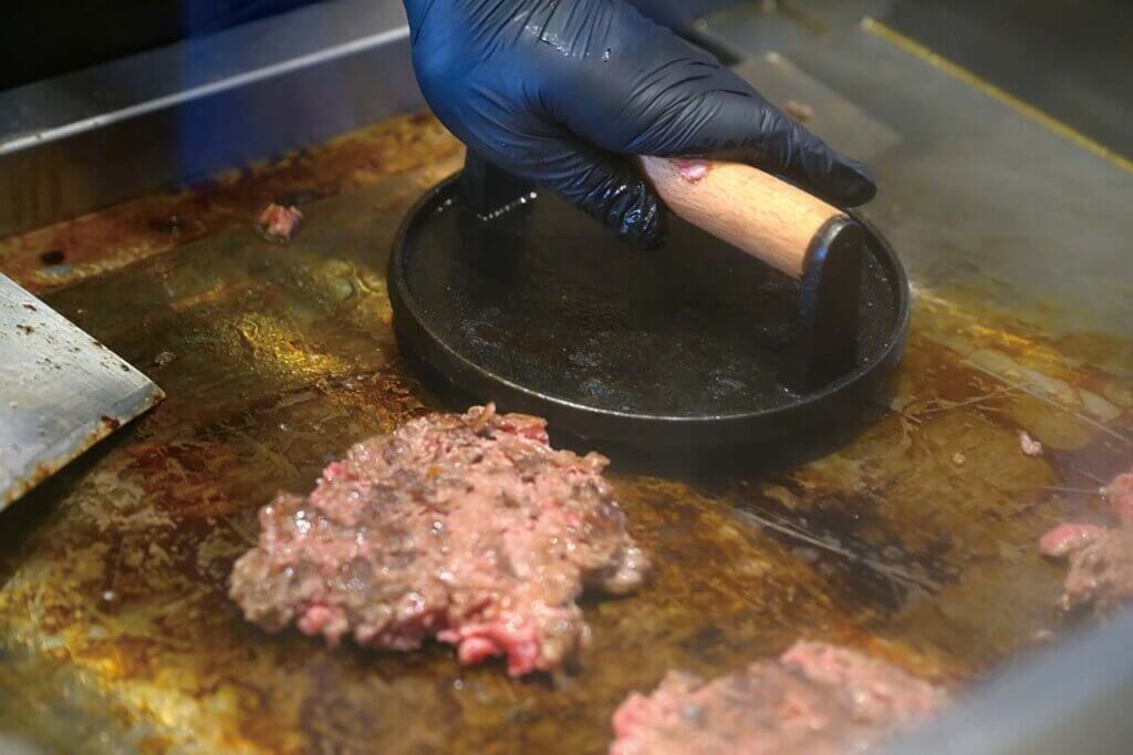 パティはプレスしてから蒸し焼きにすることで肉汁を閉じ込めます。