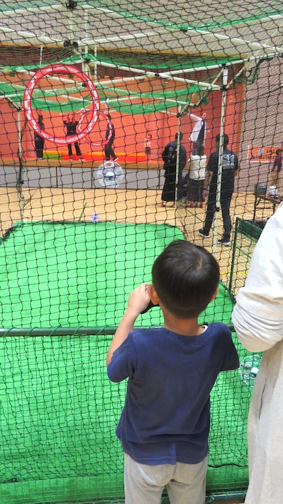 コントローラーを握った競技者は、日本ドローンサッカー連盟茨城支部のサポートを受けながら操縦を体験。不安定なドローンの動きに四苦八苦する子どもたちに、見守る親から声援が送られました。