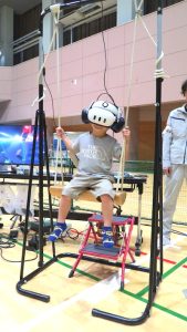 つり下げられた座席に座り、専用ゴーグルを装着して仮想現実(バーチャルリアリティー/VR)空間を体感できる「VRアトラクション」は行列ができる人気ぶり。