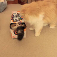 作業中に寄ってくるのはやはり猫のサガなのか、パパさんが洗った猫用トイレにシートや砂を入れている時にも、猫さんたちが大集合。兄妹の両親であるひまわりちゃんと秀吉くん、後方には先住猫ひのきちゃんの姿もあったそうです。そして、砂を入れた瞬間に…。