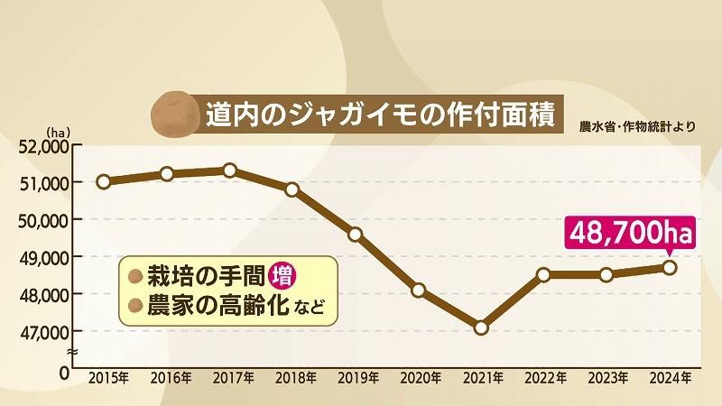 夏の高温や雨不足で栽培が大変になっているうえ、農家の高齢化で作付けする農家も減り、ジャガイモの生産量は減少傾向です。