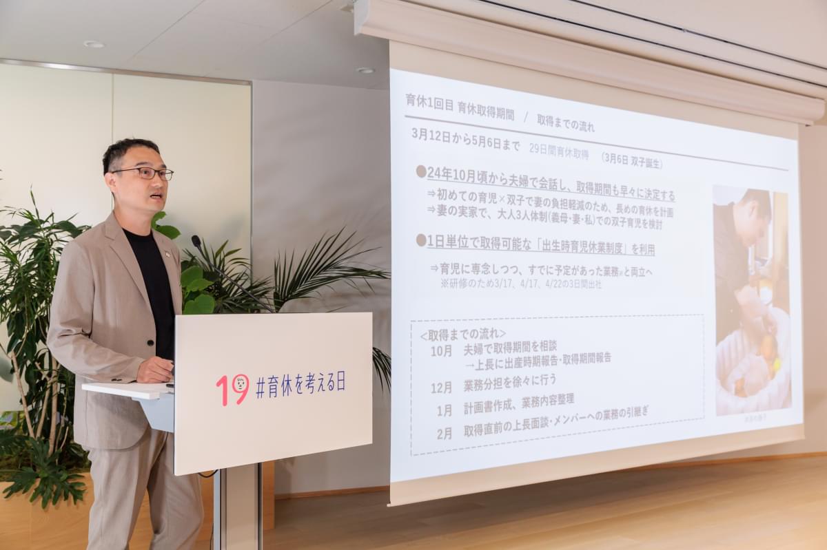 今回の発表会では、実際に育休を取得した木村昇平さん(積水ハウス株式会社 戸建事業戦略部 SI戦略室)のお話もありました。木村さんは、育休前にしっかりとコミュニケーションを取ることができたようで、とても満足のいく育休期間を過ごせたそうです。 木村さんは、育休取得の約5か月前から奥さんと相談し、会社の「家族ミーティングシート」を活用。