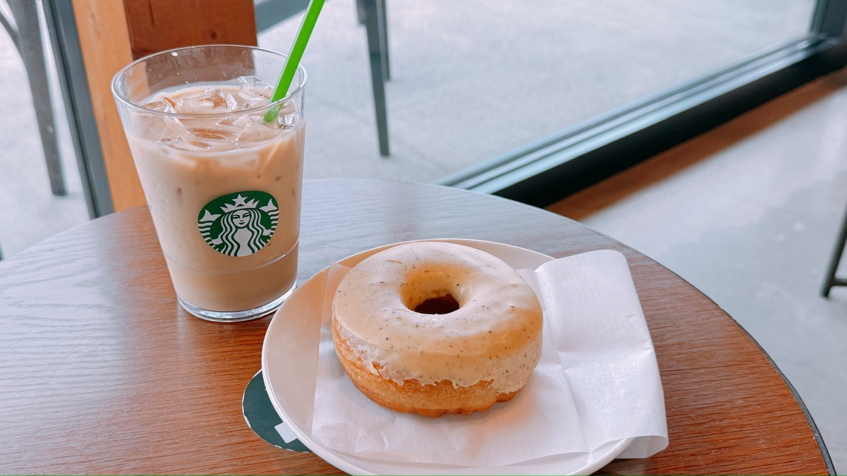 なので写真はトールサイズのアイススターバックスラテですが、注文時はショートサイズのスターバックスラテ(455円)とシュガードーナツでスターバックスラテを1サイズアップしてもらったということです。