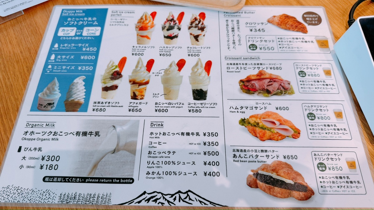 おこっぺ牛乳のミルク感は美味しく、ソフトクリームの甘さも濃すぎないです。
