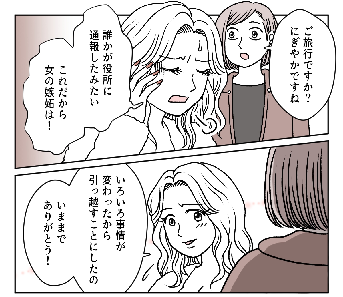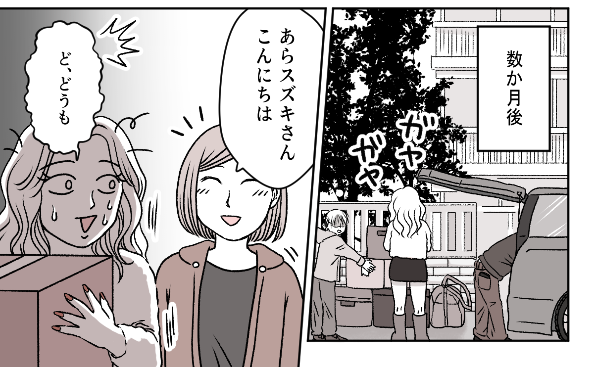 役所に電話をしてから数か月後、荷物を運び出しているスズキさん一家の姿がありました。カーテンから様子を見て私は思わずニヤリとします。スズキさんがひとりで部屋に戻ってくるタイミングを見計らって、私も偶然を装って外にでて、声をかけました。