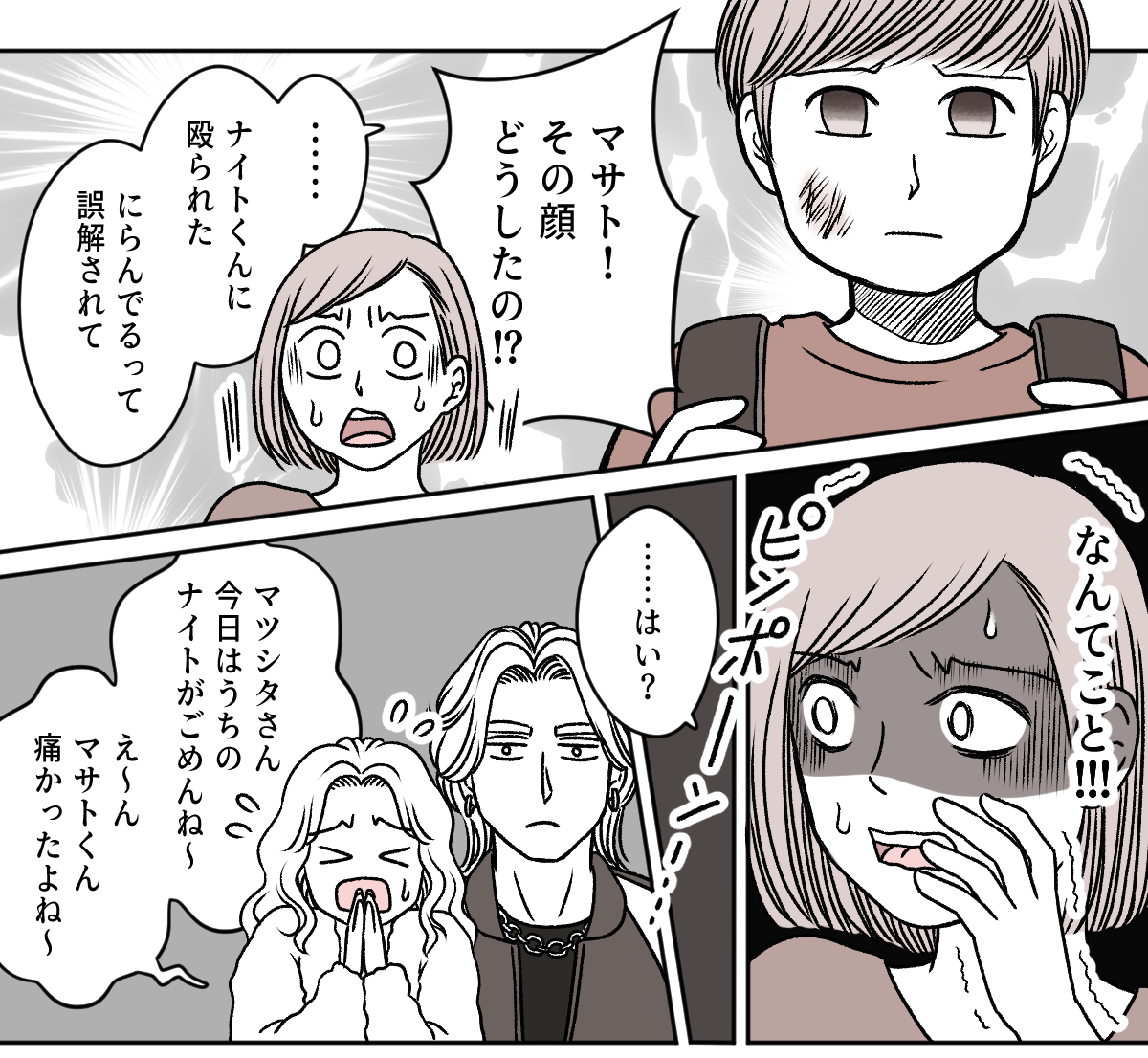 息子のマサトが顔にケガをして帰ってきました。ナイトくんから「にらんでいる」と言いがかりをつけられて、殴られたと言うのです。ナイトくんとは、スズキさんの子どものひとりで、マサトの同級生。玄関のインターホンが鳴り、応答すると、立っていたのはスズキさんとその彼氏でした。