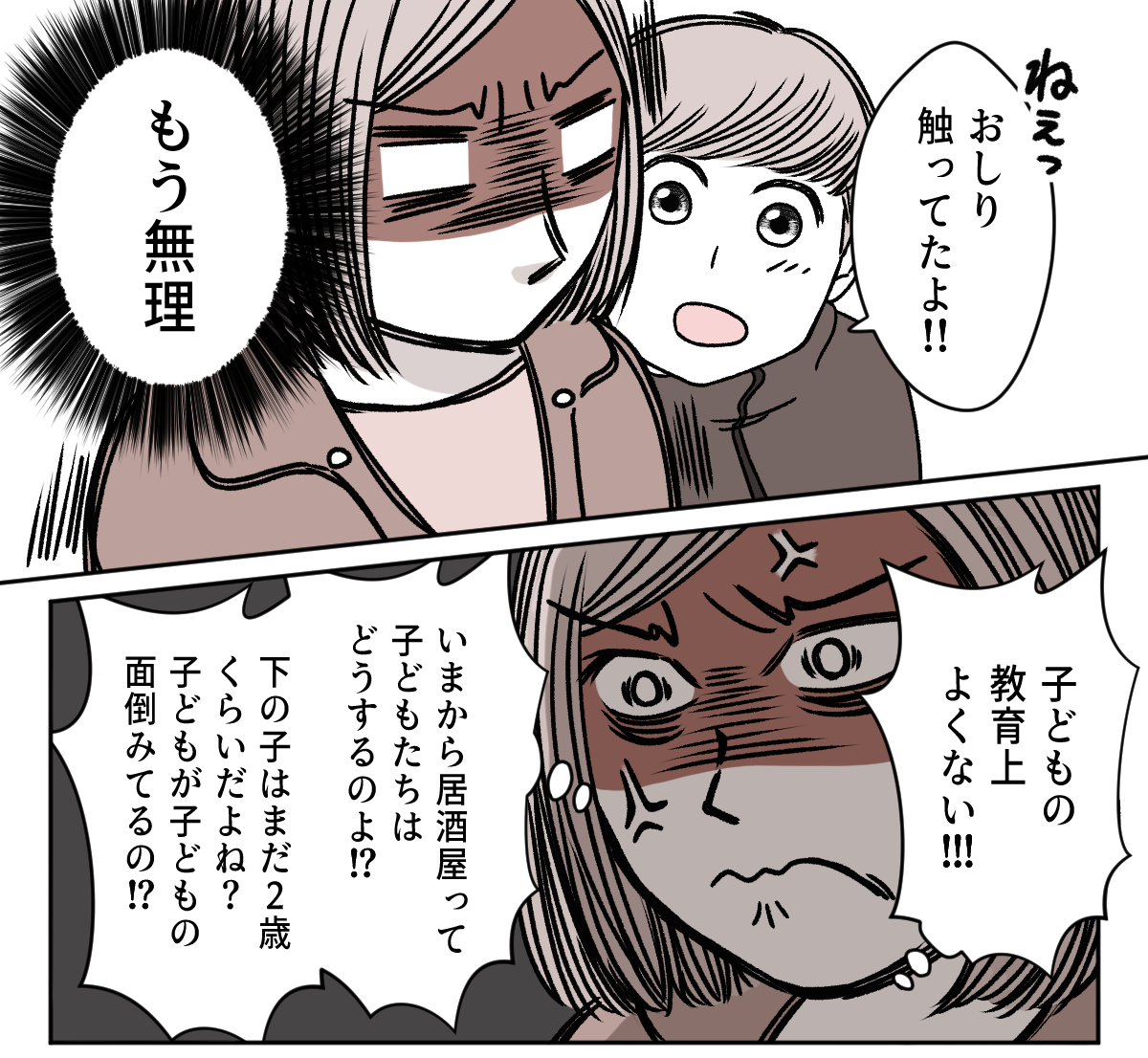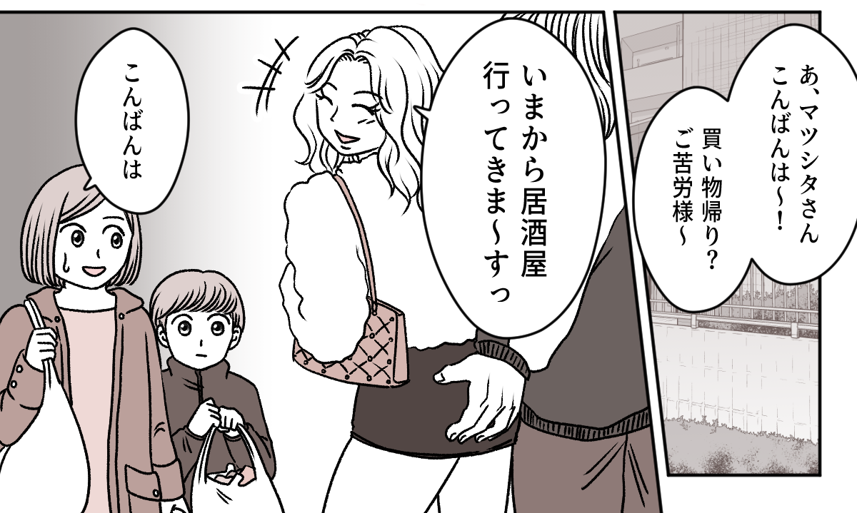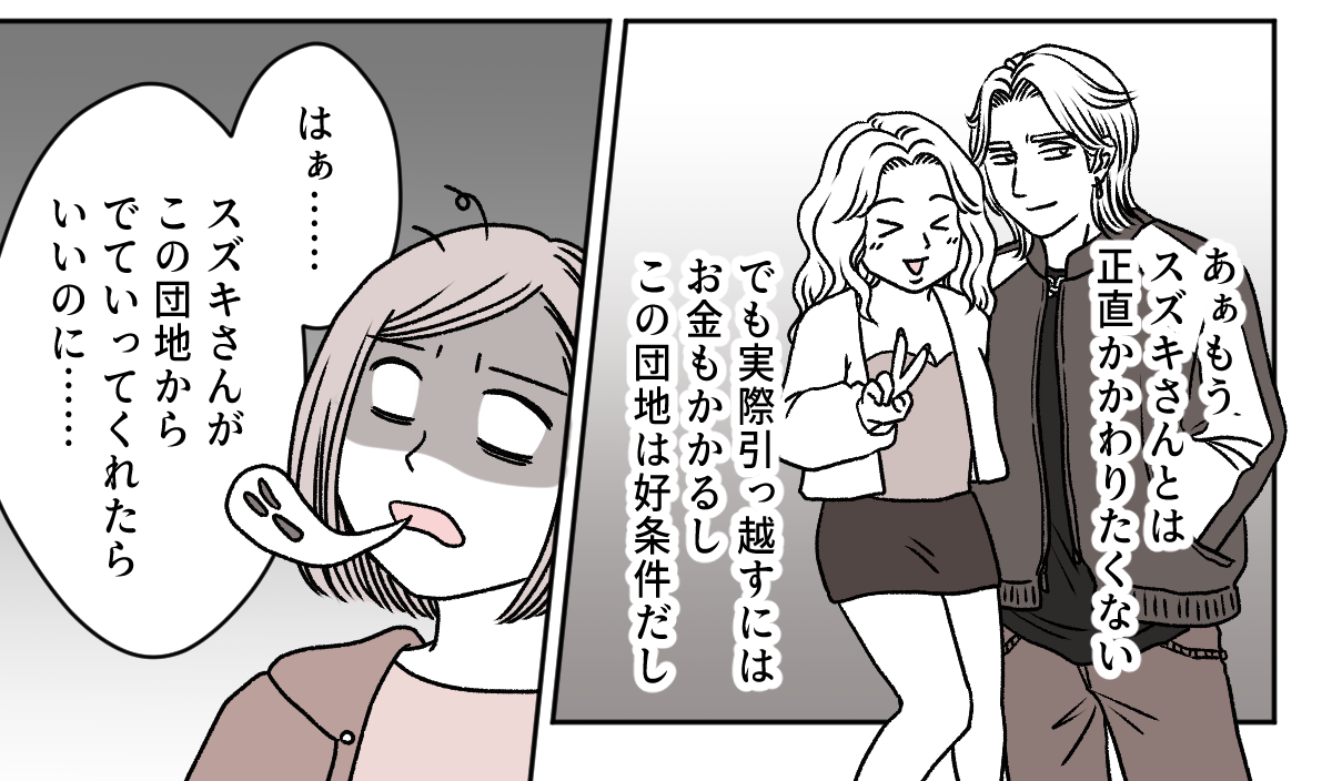 スズキさんの話しかたや服装、母親や女性としての行動は、私の価値観や倫理観とは大きくズレています。学生の頃に出会っていたら、きっと友だちにはならないでしょう。話もしないタイプだと思います。 私ひとりで生活しているのであれば、もう大人だし当たりさわりなく接して過ごせます。でも、外で彼氏におしりを触られたりするような行動は、私の息子マサトにみせたくありません。 かかわりたくないのですが、引っ越しはできれば避けたいです。つい「向こうがでていってくれたらいいのに……」そう思ってしまうのでした。