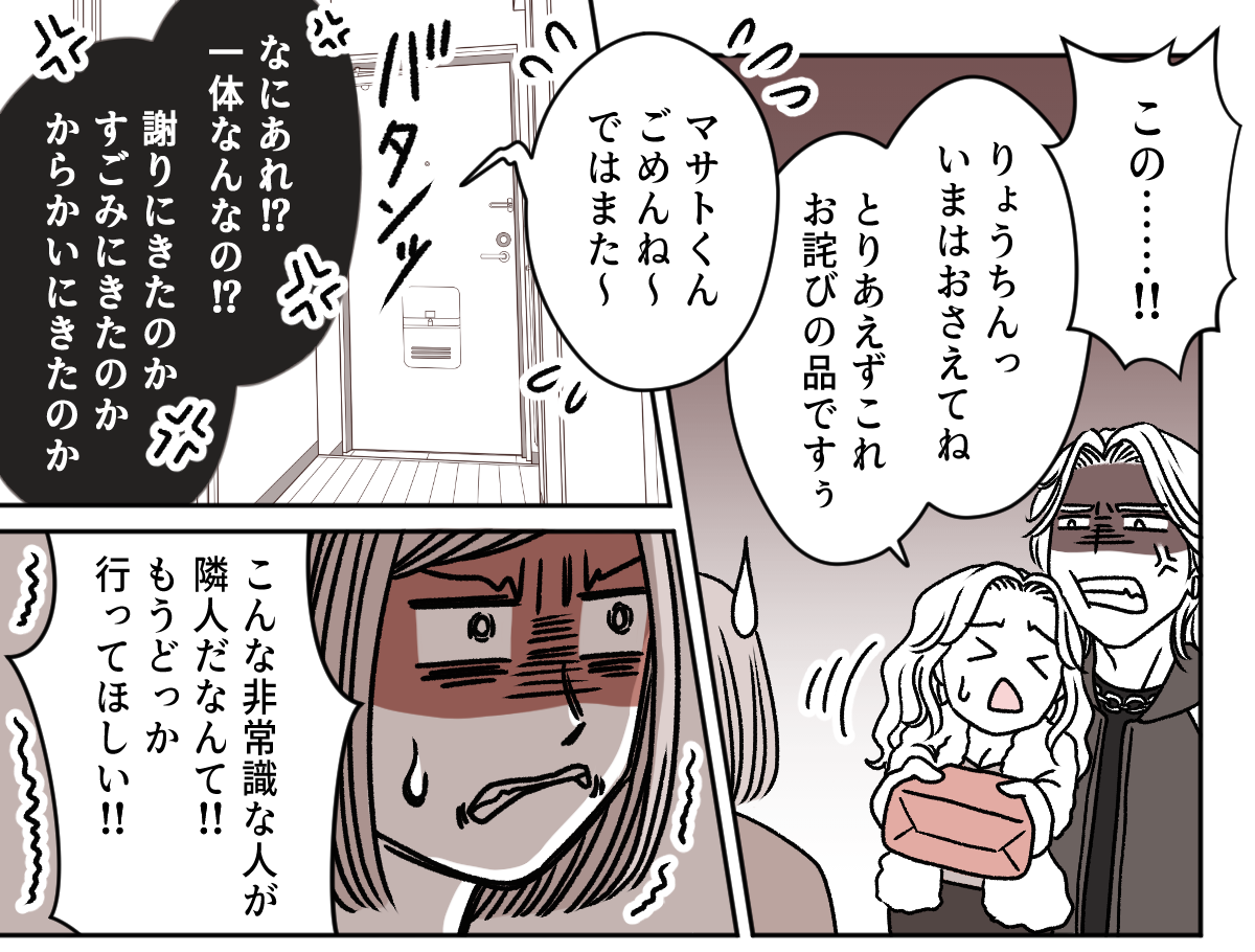 謝りに来たのか、すごみにきたのか、からかいにきたのか……スズキさんたちの行動に怒りが収まりません。どうしてこれほど非常識な人が隣に住んでいるのか。どうにかあの人たちを遠くに追いやる方法はないのでしょうか? 後日、またスズキさんが家にきました。今度はひとりです。