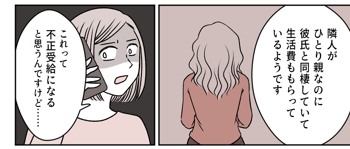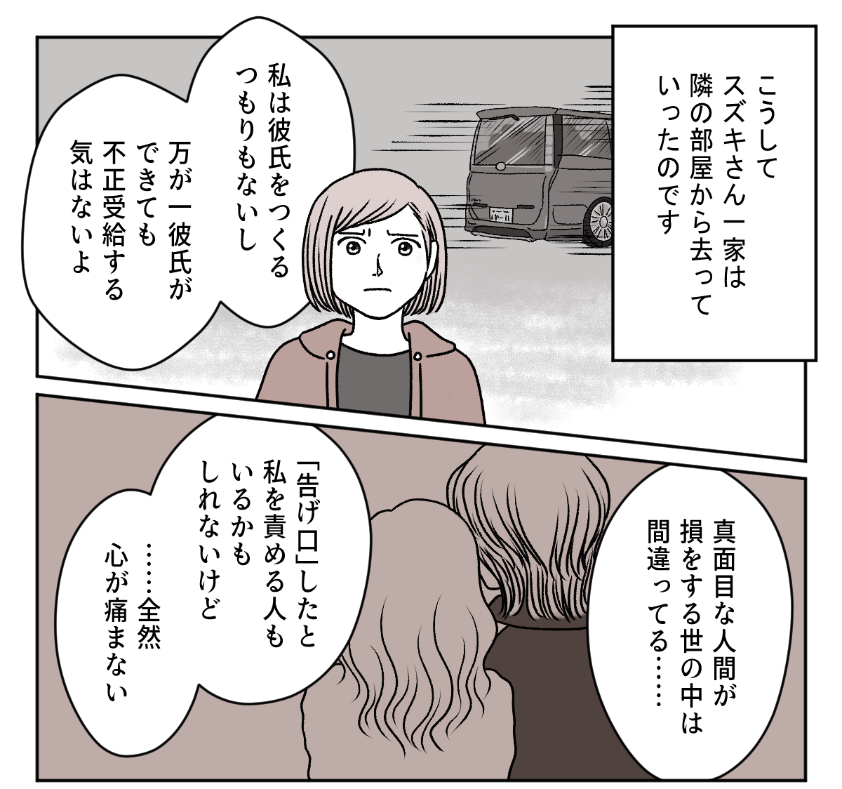 こうしてスズキさん一家は隣の部屋から去っていったのです。私は彼氏をつくるつもりもありませんし、万が一彼氏ができたとしても不正受給をするつもりはありません。真面目な人間が損をする世の中は間違っていると思います。