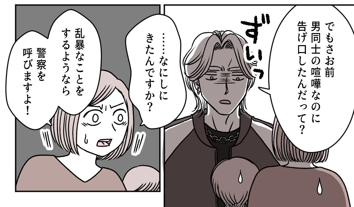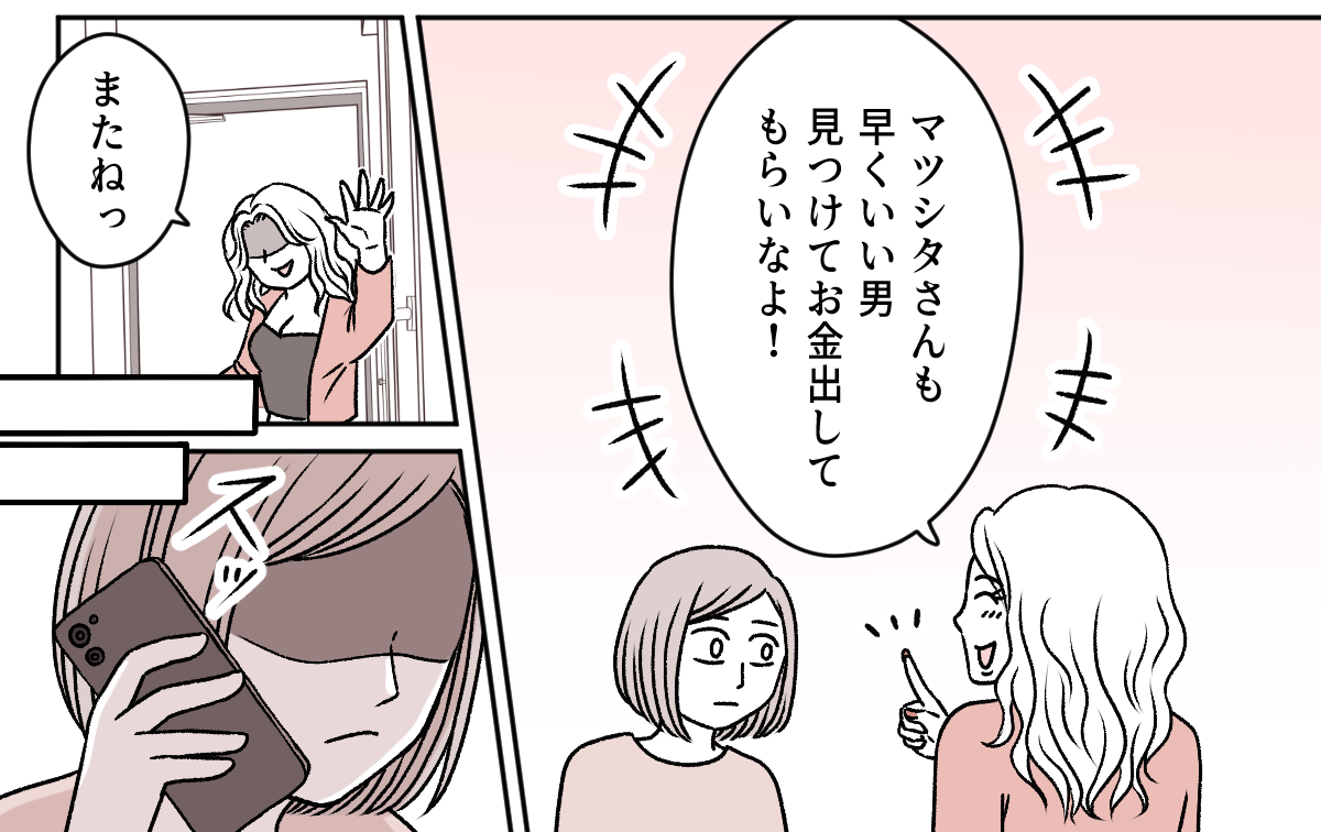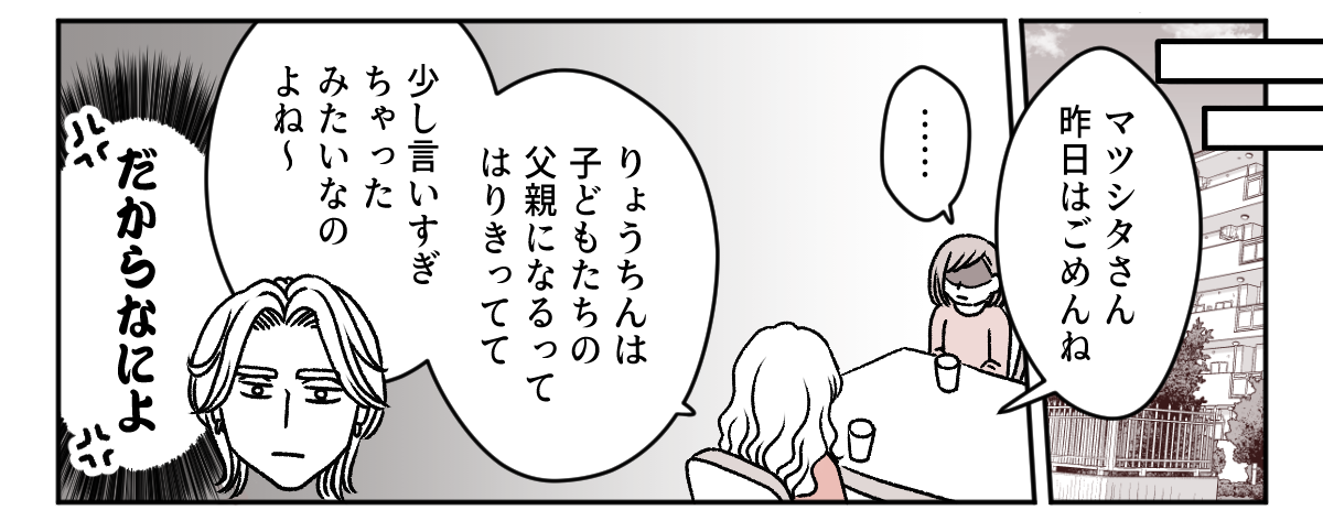マサトはスズキさんの息子に殴られたそうです。すぐにスズキさんはお詫びをしに来たけれど、口先だけに聞こえました。スズキさんの彼氏は文句を言ってくるし……。 謝罪にきたのか脅しにきたのか、まったくわかりません。身の危険さえ感じましたし、「かかわりたくない」を超えて、「いなくなってほしい」という思いでいっぱいです。 そして翌日、スズキさんはひとりでわが家にきて、身の上話を頼んでもいないのにはじめました。そこで聞いた話は、私の行動の後押しになりました。