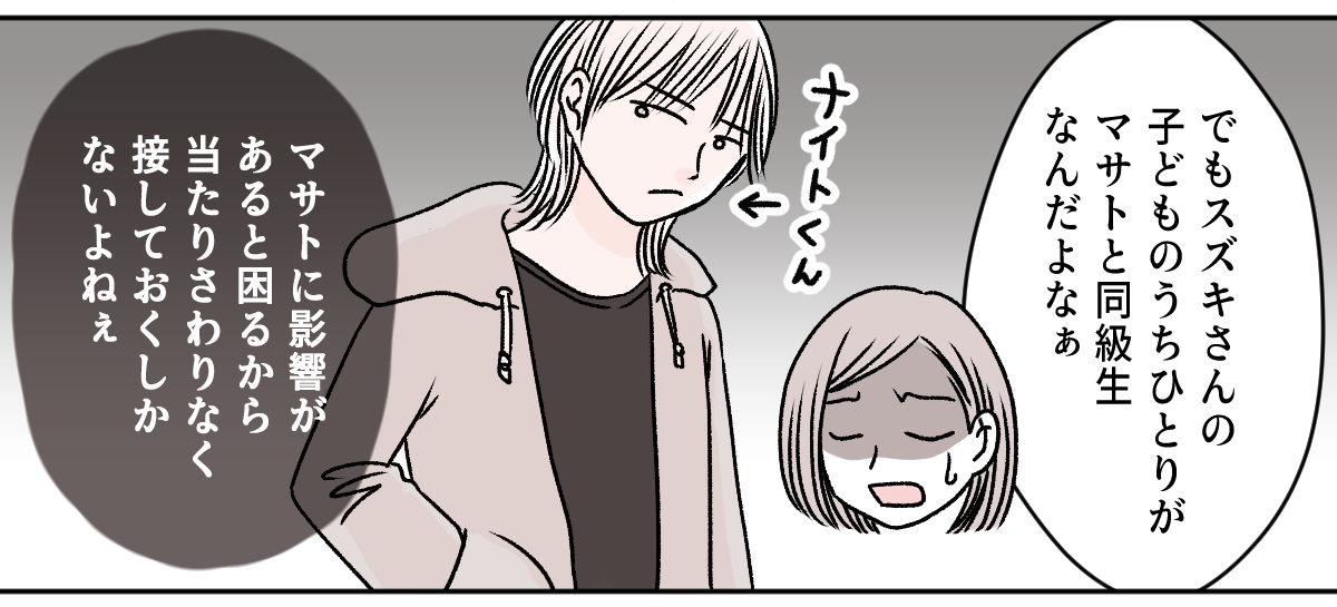 マサトは、スズキさんの子どものうち、ひとりと同級生です。だから、スズキさんのことは心底嫌いだったけれど、マサトに影響があると困るので、当たりさわりなくしていました。