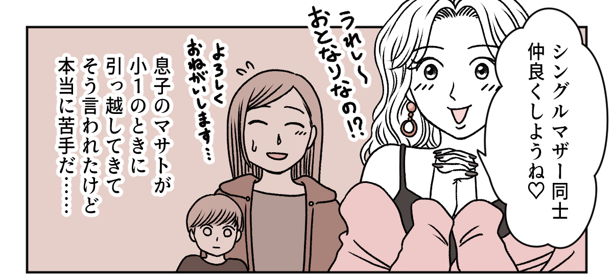 スズキさんは、私と同い年くらい。派手で胸元があいている服や、ミニスカートをよく着ています。子どもは6人。本人が言うには、全員お父さんは違うそうです。「シングルマザー同士仲良くしようね」引っ越してきてそう言われたのが、私の息子マサトが小1になるとき。いま私はシングルマザーでマサトは小4になりました。