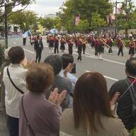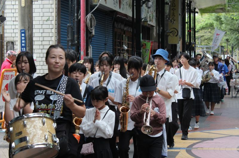 午前11時半に諏訪公園南側をオープニングパレードが出発、好きな楽器を手に自由参加した人たちと追っかけで200人近くにふくらんだ大きな列がアーケードから近鉄四日市駅北口のふれあいモール、メイン会場の市民公園へと行進した。初の試みだった前年より行進する距離も長くなった。