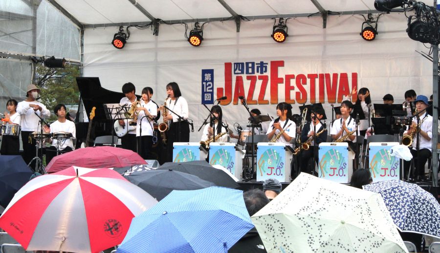 「彩~irodori~」をテーマに10月18日、第12回四日市ジャズフェスティバルが開幕した。今年は19日までの2日間でゲストを含む約120組がメイン会場の市民公園など計14の会場で生演奏を聴かせる。初日は小雨まじりのスタートになったが、傘をさしてリズムに乗る観客も多く、演奏者と気持ちがひとつになるようなステージが続いた。