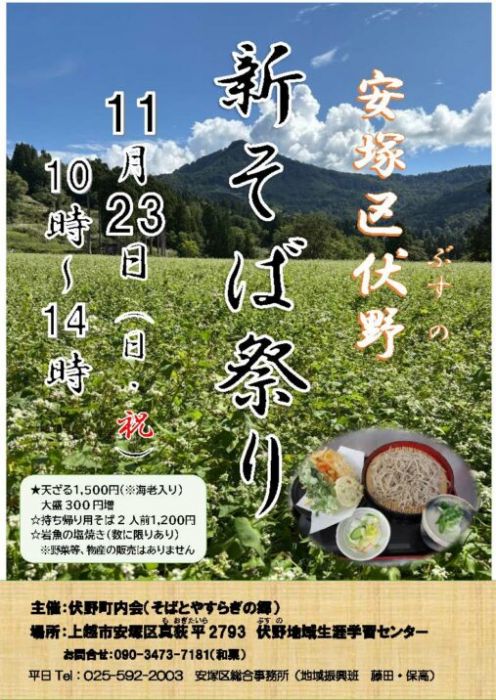 安塚区伏野の新そばを味わうイベント「新そば祭り」が伏野地域生涯学習センターで開催されます。地元産そば粉とジネンジョをつなぎにした打ち立て、切りたて、ゆでたてのお蕎麦が味わえます。メニューは天ざるが1500円(大盛りは300円増し)、持ち帰り用そばが2人前で1200円、数量限定でイワナの塩焼きも販売。