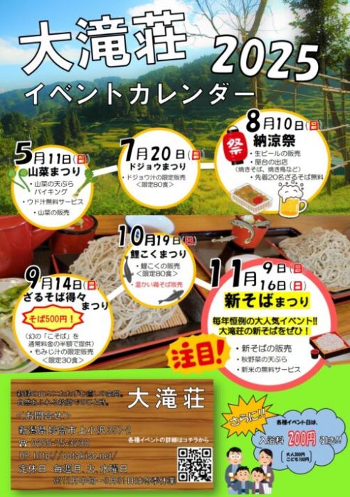 妙高市大滝荘で「新そばまつり」が開催されます。季節の野菜天ぷらなどの提供のほか、地元でとれた新米をぬか釜で炊いたおにぎり1個が先着50人に無料サービスされます。