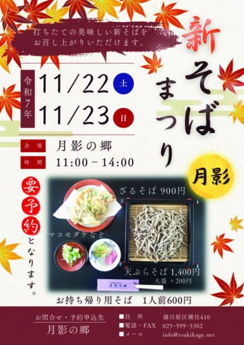 上越市浦川原区横住の月影の郷で「新そばまつり」が開催されます。「ふのり」をつなぎにした、コシがあり、のどごし抜群の打ちたてのそばが味わえます。※電話またはFAXで予約が必要です