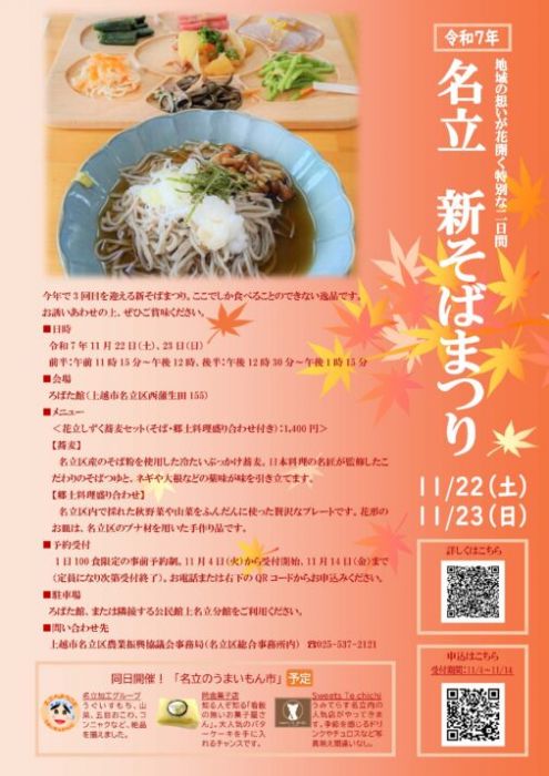 上越市名立区のそば粉を使った新そばや山菜、旬の野菜が味わえる「名立 新そばまつり」が開催されます。名立のうまいもん、農産物、菓子、パンの販売、キッチンカーも登場します。※そばは事前予約が必要です。