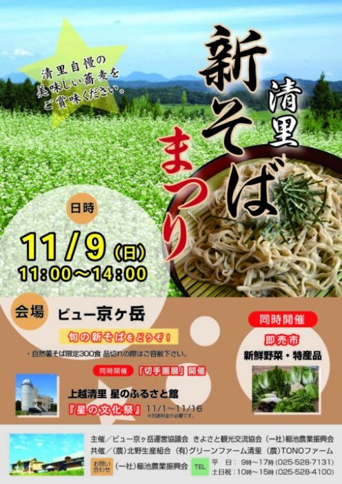 上越市清里区青柳のビュー京ヶ岳で「新そばまつり」が2週連続で開催されます。上越産そば粉を自然薯でつないだ新そばが提供されます。各日数量限定です。