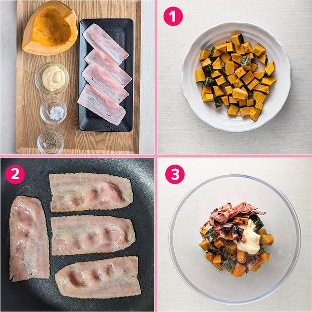 ほくっとしたかぼちゃに、香ばしいベーコンを合わせた「かぼちゃとベーコンのマヨサラダ」。甘みを抑えた塩味ベースの味付けで、食事のおかずとして楽しめます。ベーコンの塩気がかぼちゃの自然な甘さを引き立て、マヨネーズのコクが全体をまろやかに。ぜひ、作ってみてくださいね♪