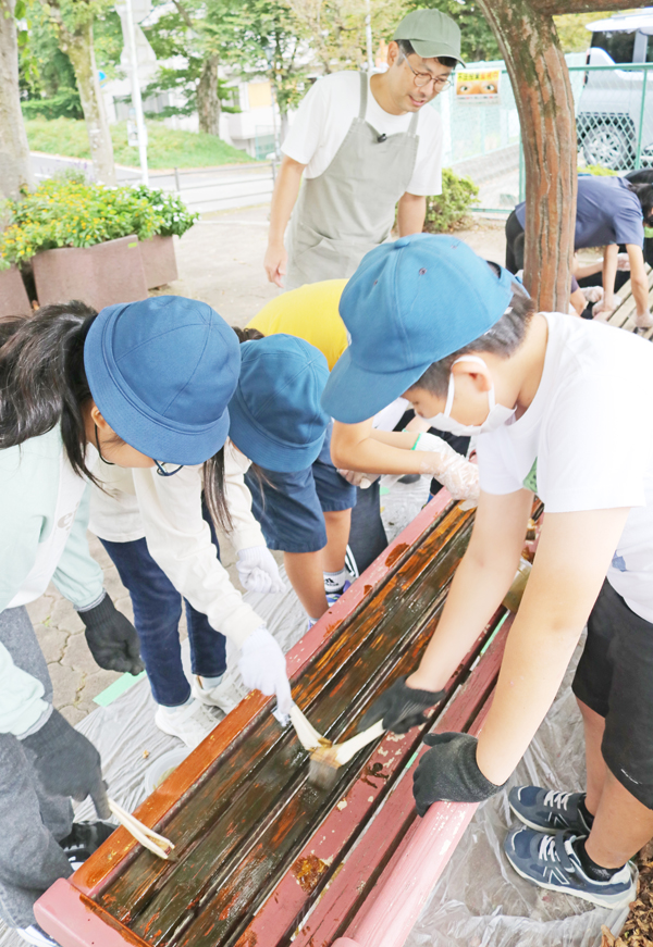 今年度スタートした造形クラブには、6年生14人が参加。まだ実施回数は少ないが、10月には学校前のポケットパークで、名張地区まちづくり推進協議会のメンバーと協力し、木製ベンチ3基の塗り直し作業に取り組んだ。紙やすりで傷んだ表面を削り取った後、はけで保護塗料を塗布していった。