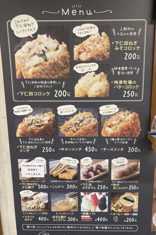 「下仁田」といえば「下仁田ねぎ」が有名ですね。ということで、下仁田ねぎ・しいたけ・蒟蒻が入った「下仁田コロッケ」と、上野村の十石みそを使用した「下仁田ねぎみそコロッケ」などを購入。ホクホク熱々でどれもおいしい!
