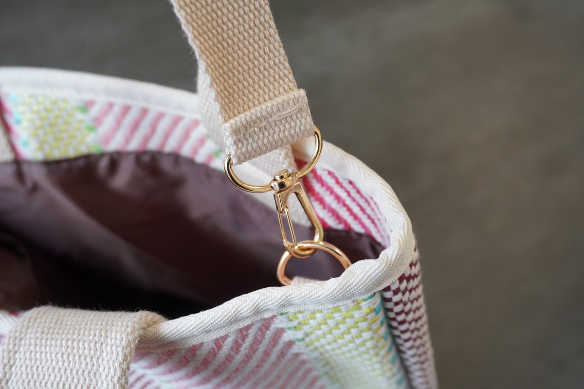 立体感のある厚手の生地を使用したトートバッグで、総柄のストライプが明るく、フェミニンな印象を受けます。