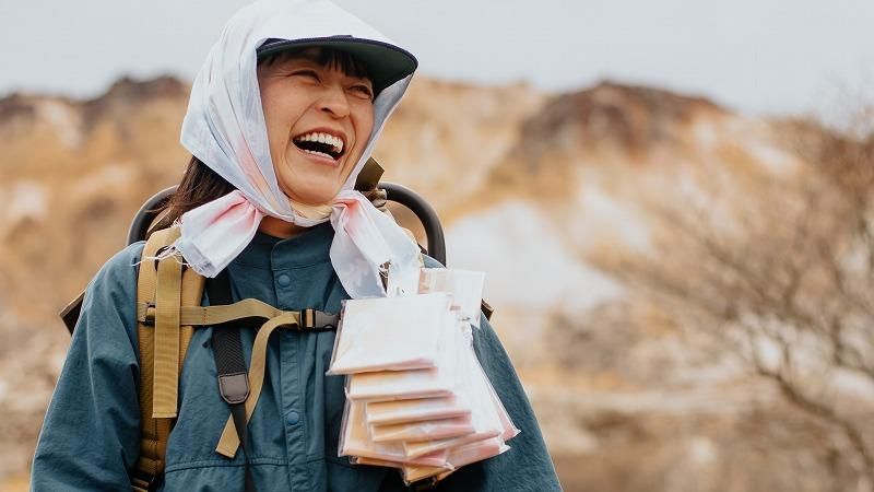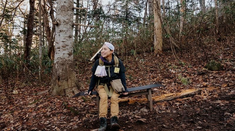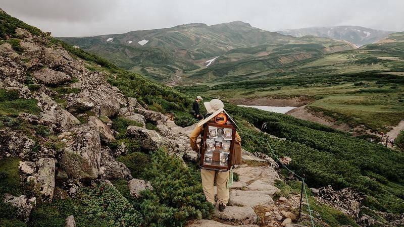 北海道のどこかの山で背負子を背負って現れる「お菓子売りのてくてく」さん。