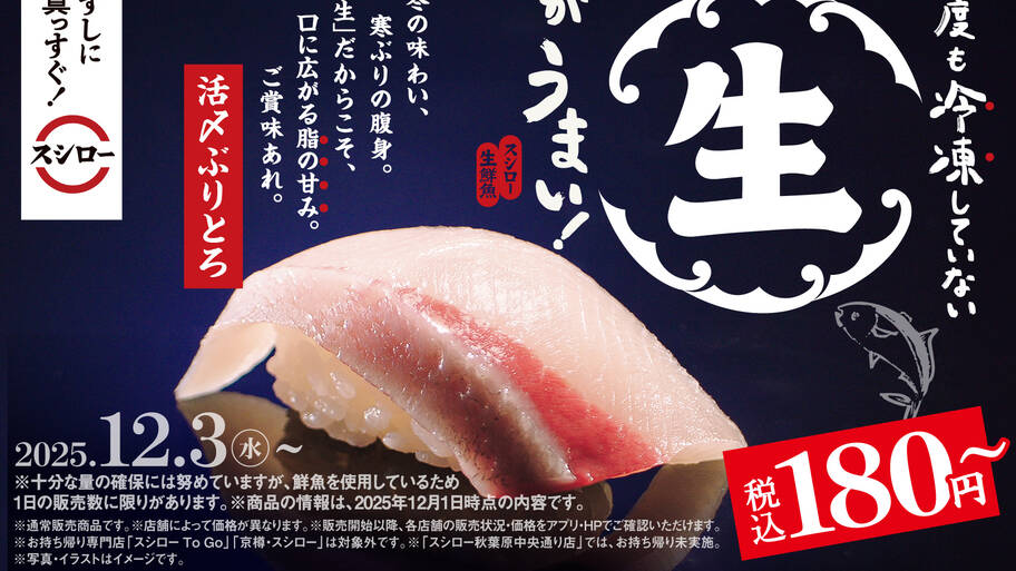 本フェアの目玉商品として、「厳選まぐろ中とろ」を期間限定で100円(税込110円)で提供します。赤身と脂のバランスが良く、とろけるような味わいが特長です。この特別価格での販売は、2025年12月2日(火)から12月9日(火)までの8日間限定です。また、大葉とおろし生姜の爽やかな風味が真いかの甘みを引き立てる「大葉真いか握り」、シャリに合うよう特製ダレで焼き上げた「炙り豚たん」も100円(税込110円)で販売します。