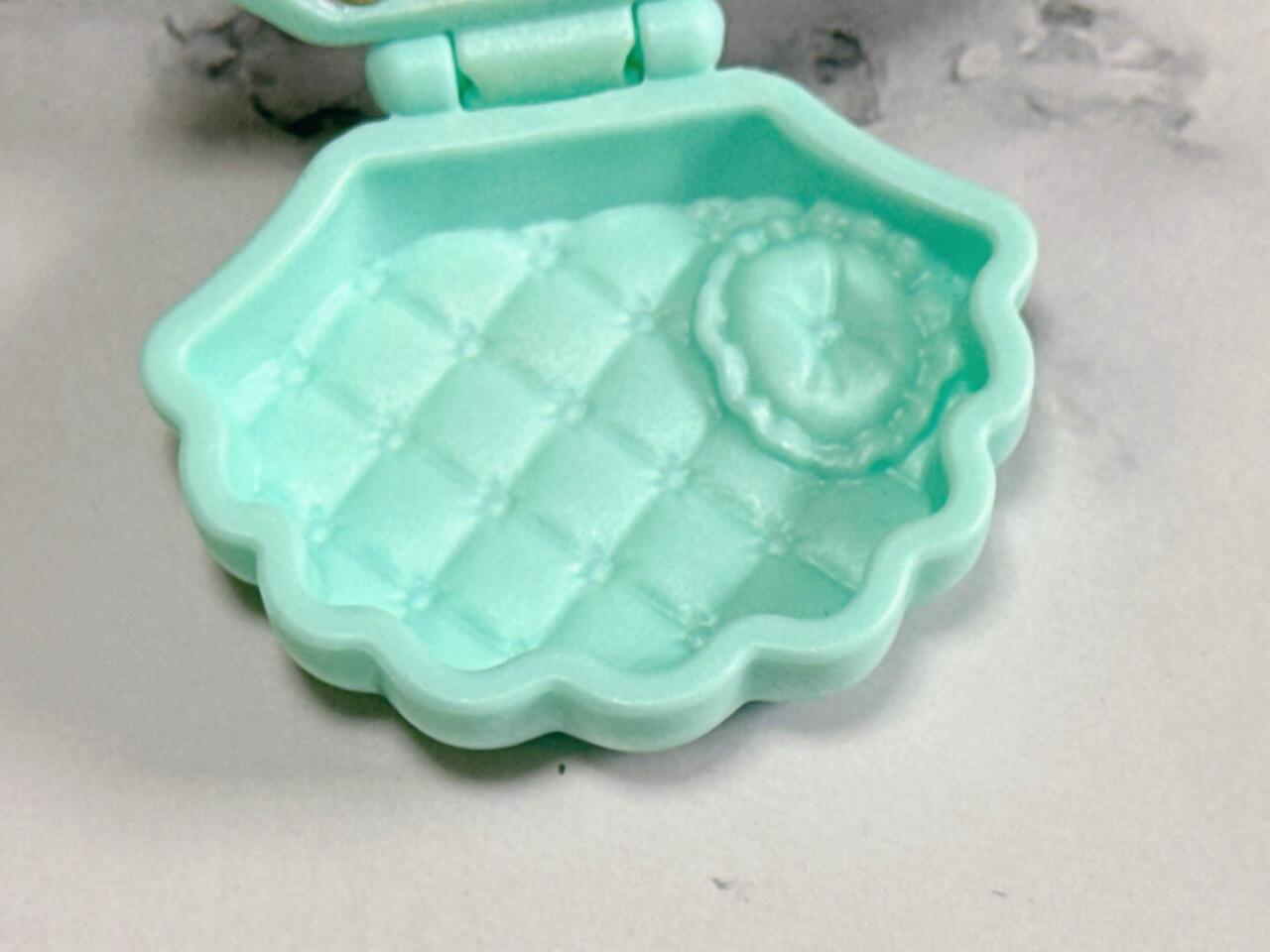 セットのベッドもとても豪華!マーメイドらしいエメラルドグリーンのシェル型のベッドで、パカッと開きます。蓋側はピンクで、ゴールドのシェルの模様付き♪