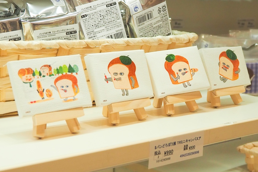 さらに、何が出るかは開けてからのお楽しみ♡な「パンどろぼう展」描き下ろしのイラストを使った「トレーディングミニキャンバス」(990円)など、ギフトにもぴったりのラインナップです。