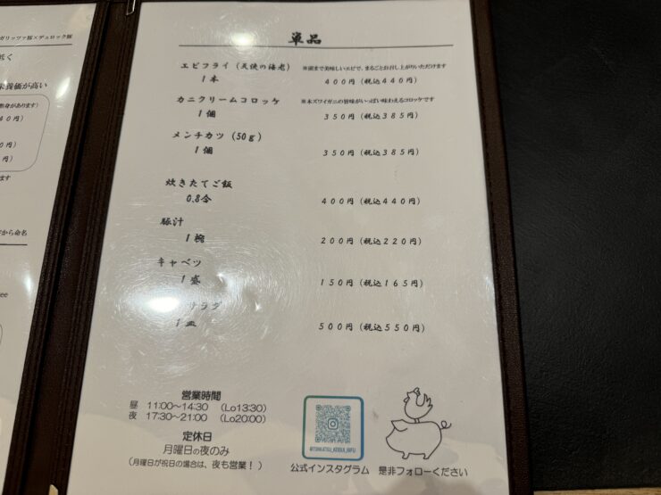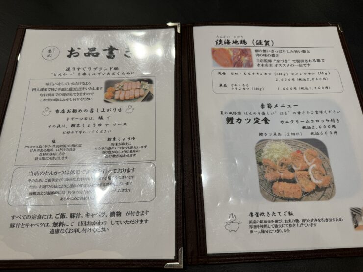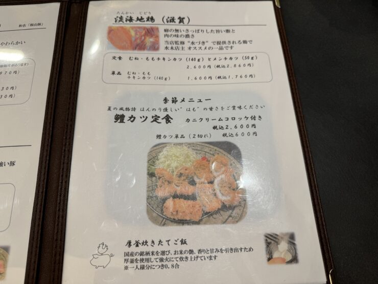 季節のメニューには美味しい魚介のカツが提供される。例えば、春はキス、夏はハモ、秋はアジ、冬は牡蠣などだが、そのどれもが絶品であるため、トンカツの定食に追加で魚介の単品を追加することをおすすめしたい。